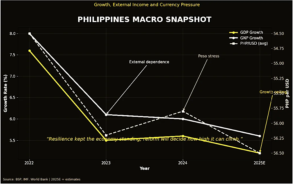 Vantage Point culled data from the BSP, IMF and World Bank to create this graph: As headline GDP growth cools and the peso remains under pressure, GNP continues to outpace domestic output — highlighting the Philippines’ dependence on external income even as structural limits cap post-rebound growth. The next phase hinges not on resilience, but on reform. Sources: Bangko Sentral ng Pilipinas, International Monetary Fund, World Bank; 2025E = estimates.