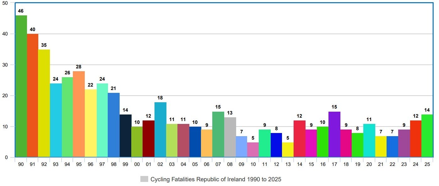 A total of 14 cyclists were killed on the roads in 2025, up from 12 in the previous year and seven in both 2021 and 2022. Though far more cyclists were killed in the 1990s – with 46 fatalities in 1990, for example – the sheer number of fatalities in 2025 was large in the context of the past 25 years.