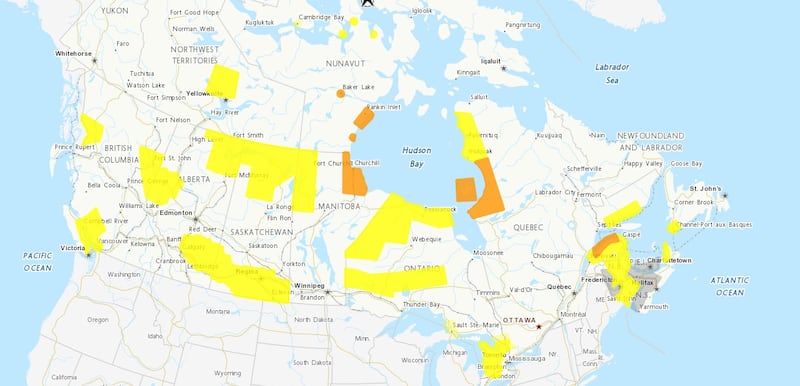 Further north, the Northwest Territories’ North Slave Region, including Wekweeti-Whati-Behchoko, was under a cold weather warning. Wind chill values near -50 are expected.