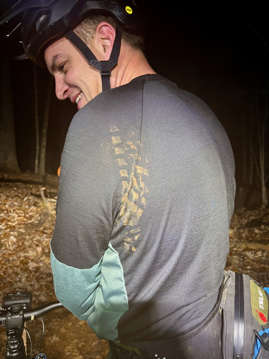 “Heck yeah,” Lee said. He went first, then slipped out immediately. Sam ran over him. When Lee stood up, a perfect muddy tread pattern from Sam’s tire crossed the back of his jersey. We all cracked up.