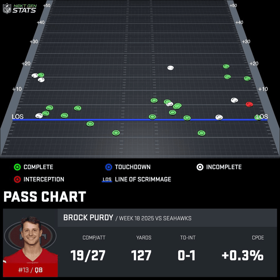 A 10 percent success rate on the ground is embarrassingly bad on its own, but it looks even worse considering how the Seahawks deployed their defense on Saturday night. They played with at least five defensive backs on every snap and had an average of 6.5 men in the box, per TruMedia. Seattle played light, with both personnel and structure, yet the 49ers—who were without star left tackle Trent Williams, to be fair—couldn’t move them in the ground game, which had a knock-on effect on the pass game, with San Francisco playing behind the chains most of the game. Seattle was able to play its zone coverages, and the defensive line could play in pass rush mode all night. Purdy was under constant duress and had to settle for short passes underneath, and Shanahan’s play calls failed to unlock the deep parts of the field.