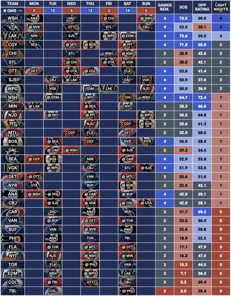 If you’re looking for a full breakdown of every team’s upcoming schedule, check out our Fantasy Hockey Strength of Schedule Tool — updated daily to show which teams have the most games and valuable light-night matchups each week.