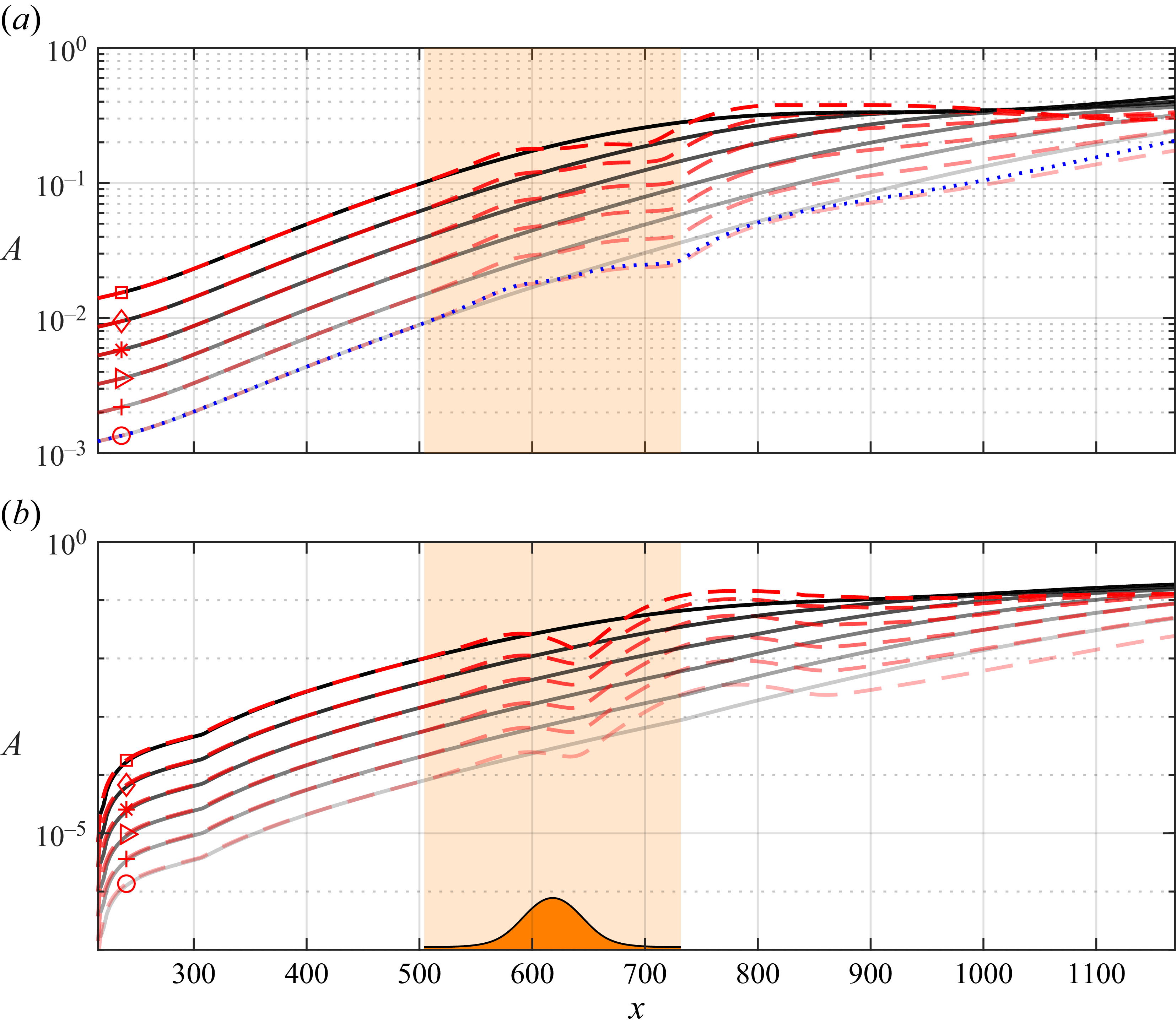 -factor method is linear per definition, the effect of perturbation amplitude is generally ignored. Indeed, both Eppink (Reference Eppink2020) and Rius-Vidales & Kotsonis (Reference Rius-Vidales and Kotsonis2020) noted that single-parameter models neglect key aspects of the underlying physics such as the incoming perturbation amplitude. These can be conditionally extracted in experiments or high-fidelity simulations. However, detailed parametric studies of the interaction between surface modifications and incoming instabilities are hindered in experiments by measurement limitations (noise, field of view, reach and intrusion) near the surface and numerically by the large computational costs involved with running transitional DNS. For those reasons, few studies are concerned with the effect of the incoming perturbation amplitude on the interaction with surface modifications at the scale of the boundary layer instabilities. Weakly nonlinear stability theory, as shown by e.g. Wu (Reference Wu2019), could be applied to perform stability calculations more efficiently. However, weakly nonlinear theories require a hierarchical ordering of the terms based on amplitude (Bertolotti, Herbert & Spalart Reference Bertolotti, Herbert and Spalart1992). Since this hierarchy is not generally known a priori, at least for the presently investigated flows, its application may not be valid for all inflow amplitudes. To prevent the weakly nonlinear assumption from affecting the analysis, a fully nonlinear framework is used here instead. In summary, the limitations of both traditional numerical and experimental approaches in tackling the interaction of boundary layer instabilities with surface modifications motivated the development of an efficient harmonic Navier–Stokes (HNS) framework as used in the present work (Westerbeek et al. Reference Westerbeek, Hulshoff, Schuttelaars and Kotsonis2024).