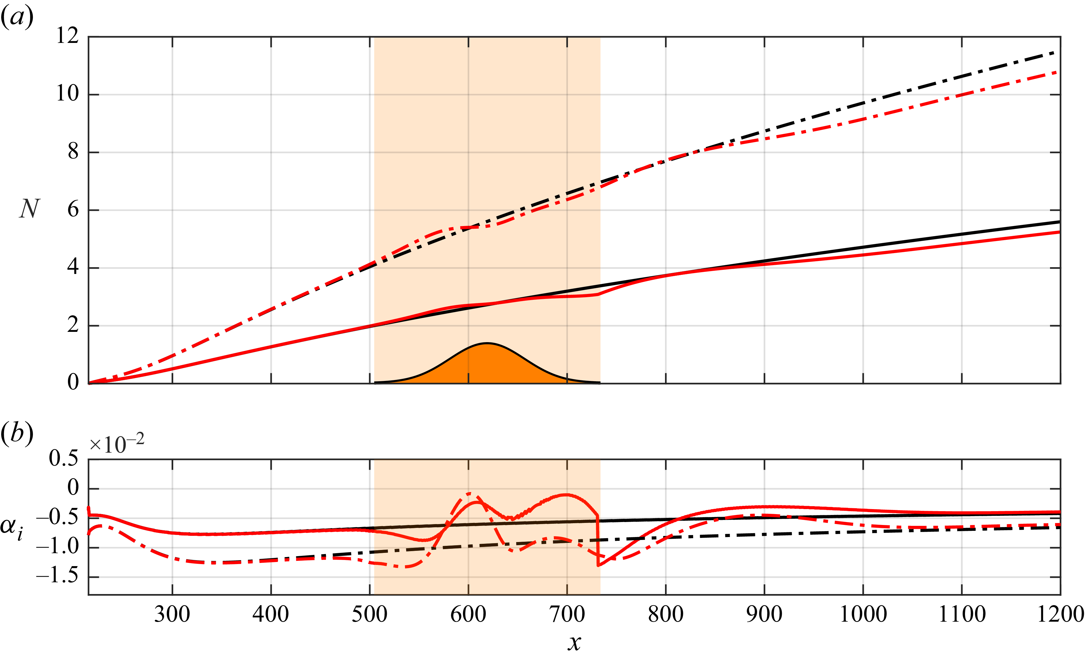 Wu & Hogg (Reference Wu and Hogg2006) argued that incoming TS waves interacting with a localised surface feature are scattered due to the rapid spatial distortion of the base flow around the feature. The effect of the surface feature on the instability amplitude is quantified through a so-called transmission coefficient. Xu et al. (Reference Xu, Sherwin, Hall and Wu2016) further investigated the behaviour of incoming TS waves interacting with rapid localised base-flow distortions (