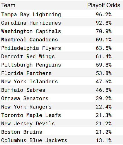 The first site, Money Puck, gives the Canadiens a 69.1% chance of qualifying for the playoffs. They’re also projecting Montreal’s odds of winning their first round series at 31.7%. To make matters more interesting, they also suggest Montreal has a 22.2% chance of finishing second in the Atlantic Division.