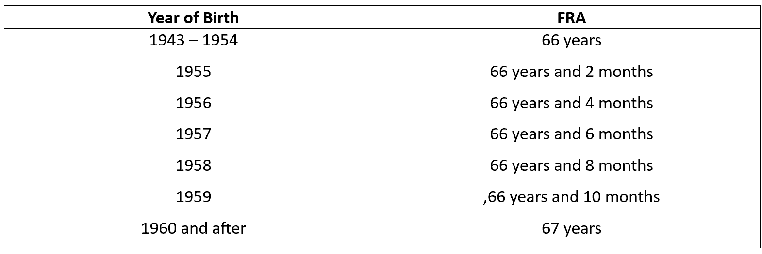 *Note: For purposes of age, the Social Security Administration considers an individual to be “of age” as of the day before the individual’s birthday. Two examples: (1) An individual born on July 2,1959 is of age as of July 1. This means the individual’s FRA (66 years and 10 months) occurs on May 1, 2026; (2) An individual born on July 1,1959 is of age as of June 30. This means the individual’s FRA (66 years and 10 months) occurs on April 30,2026.
