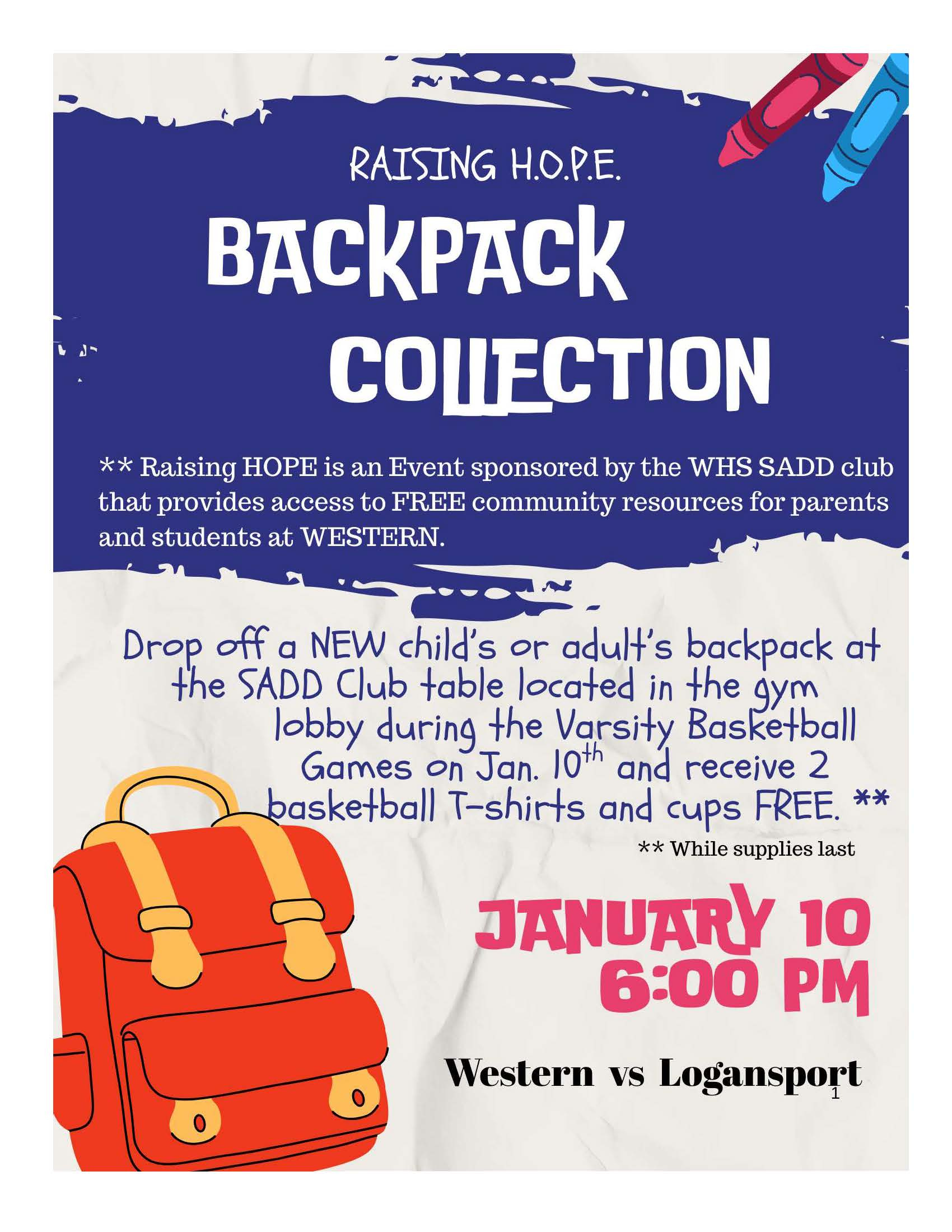 The SADD – Students Against Drunk Driving — club at Western High School will host a Back-to-School night in August as a Raising HOPE Community Event. In preparation for that effort, the club will host a backpack collection at the Western boys’ and girls’ varsity basketball games taking place Sat., Jan. 10.