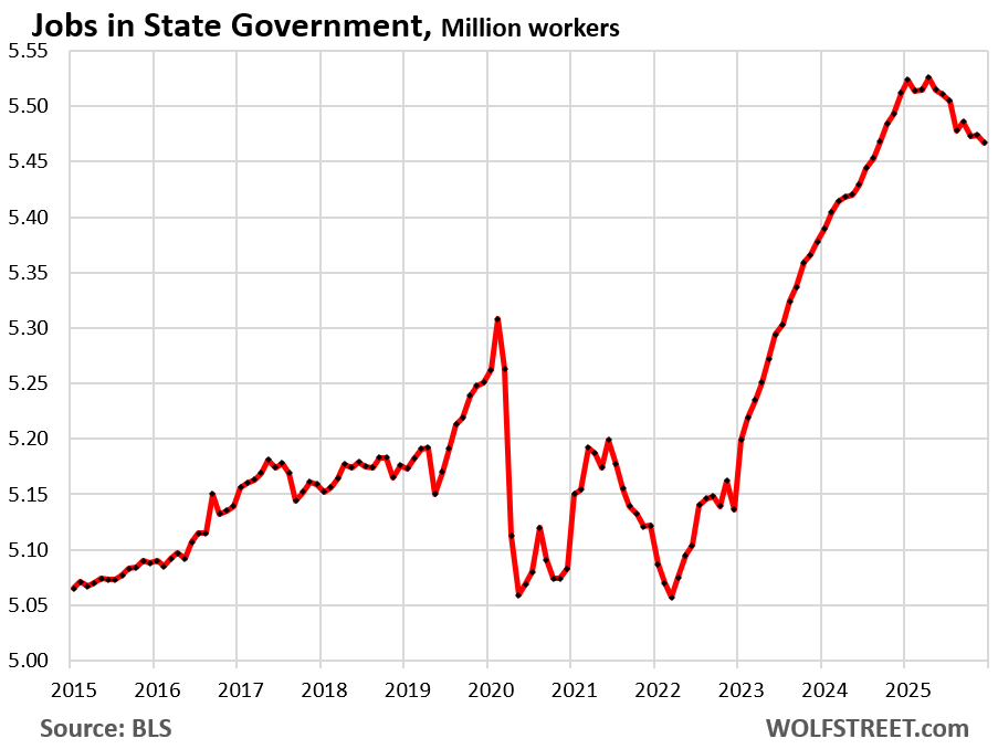 The job losses at the federal government and at state governments have hit nonfarm employment all year, and hard. In 2025, the federal government shed 264,000 jobs, and state governments shed 47,000 jobs, combined 311,000 jobs, according to the Bureau of Labor Statistics today.