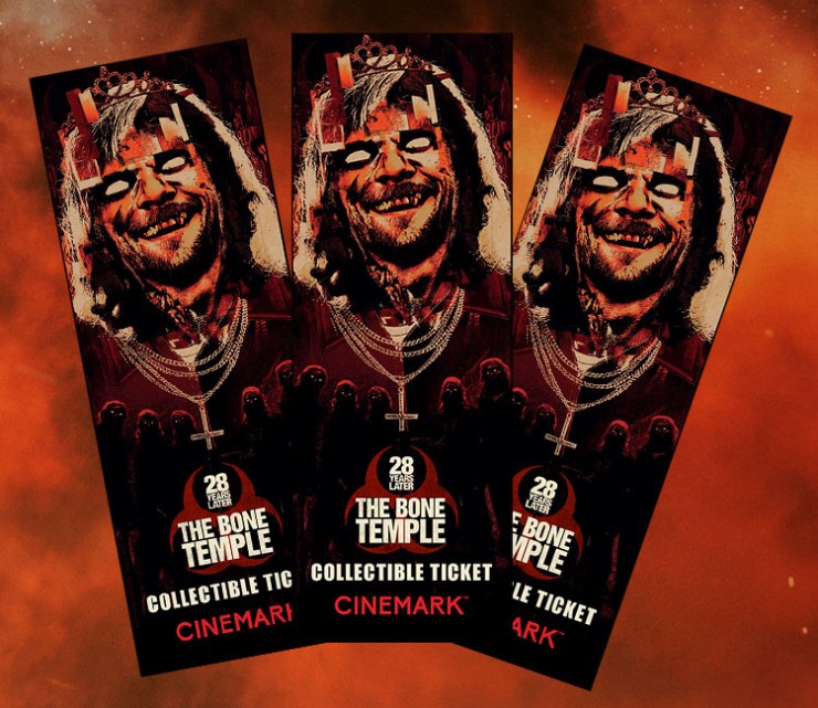 Jack O’Connell takes center stage as violent cult leader Jimmy Crystal on Cinemark’s exclusive 28 Years Later: The Bone Temple poster designed by Anthony Petrie.
