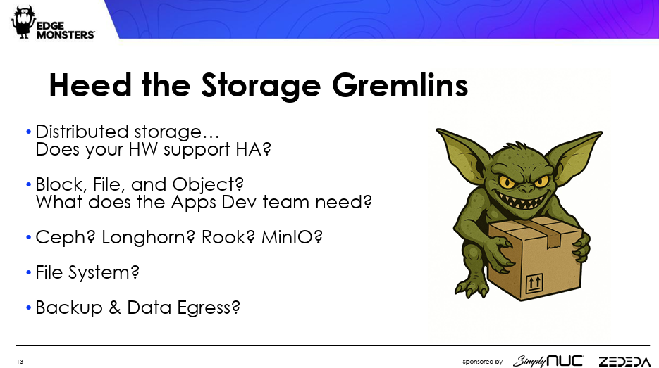 Of course, every edge setup has its own needs, so you need to determine what kind of storage is best, be it block, file or object storage. What is your file system, and what requirements does it have? Ceph, for instance, requires multiple disks.