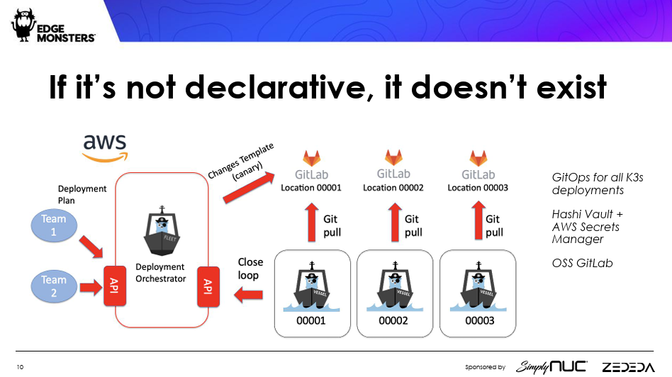 “It’s fairly simple to build and maintain a solution that has a bunch of Git repos,” Chambers said. It “assigns something location-specific to an agent that lives at the edge that pulls that stuff down and applies changes, and then closes the loop back via an API.”