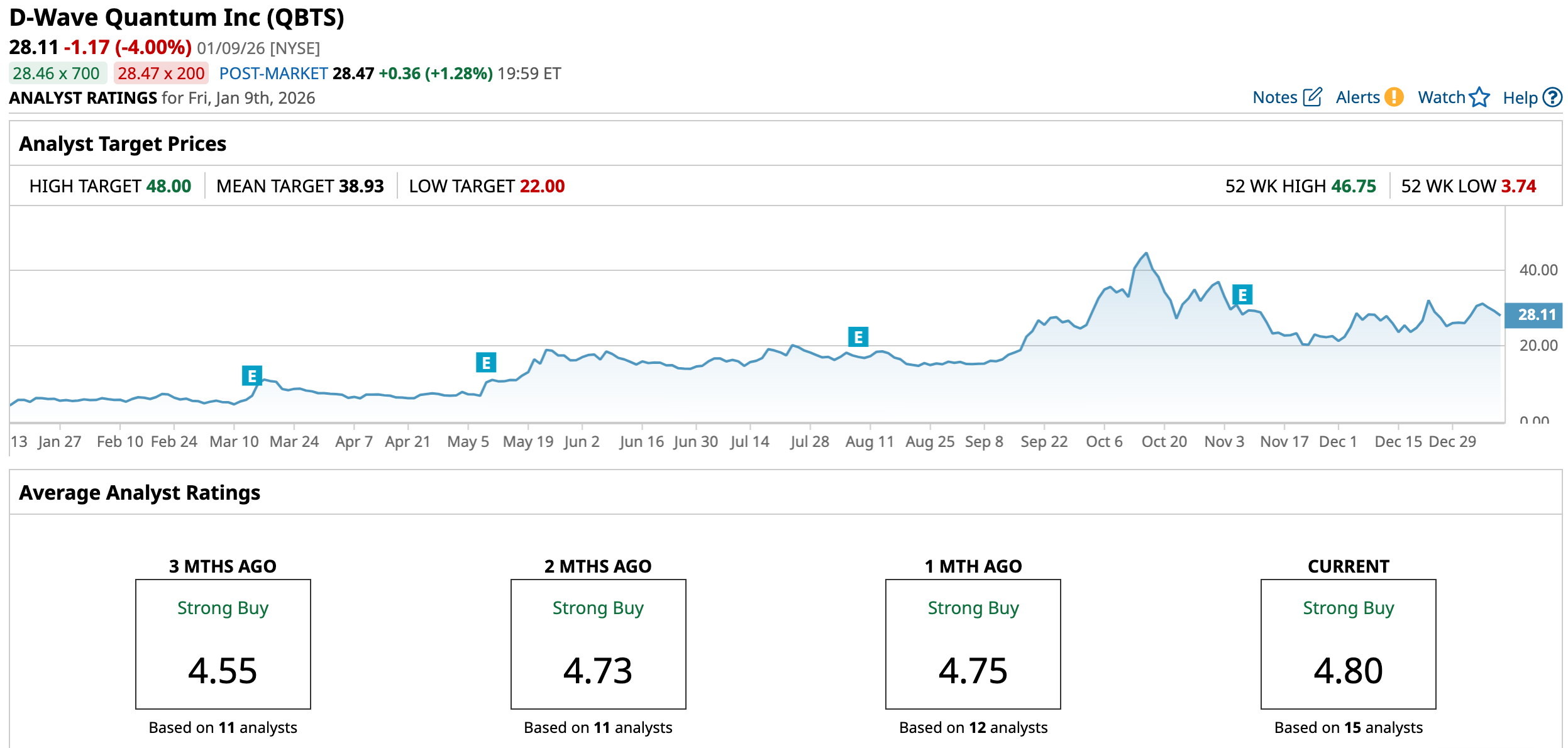 Of 15 analysts surveyed, 13 rate QBTS a consensus “Strong Buy,” one as a “Moderate,” and one as a “Hold,” and the mean target is $38.93. Against the current price of $28.11, that implies a 38.5% upside.