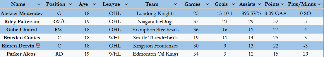 Over in the OHL, Riley Patterson continues to scorch the league. With another three points (one goal, two assists) in two games, he briefly climbed to second in league scoring before settling back to fourth. He now has 52 points in 37 games, just five back of the league leader.