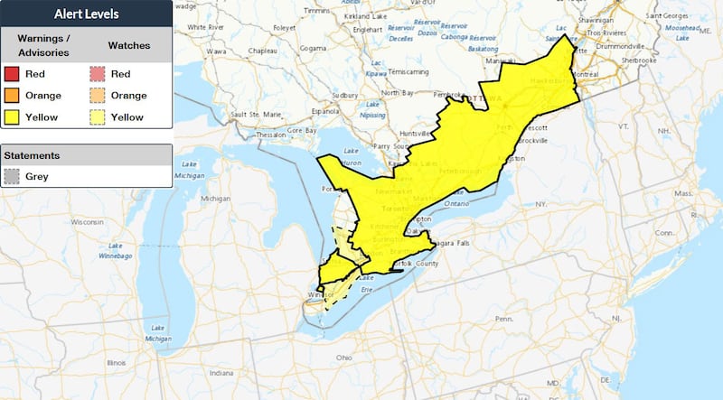 Weather advisories in southern Ontario Map highlights where weather advisories and statements have been issued in southern Ontario as of Tuesday afternoon. (Environment Canada)