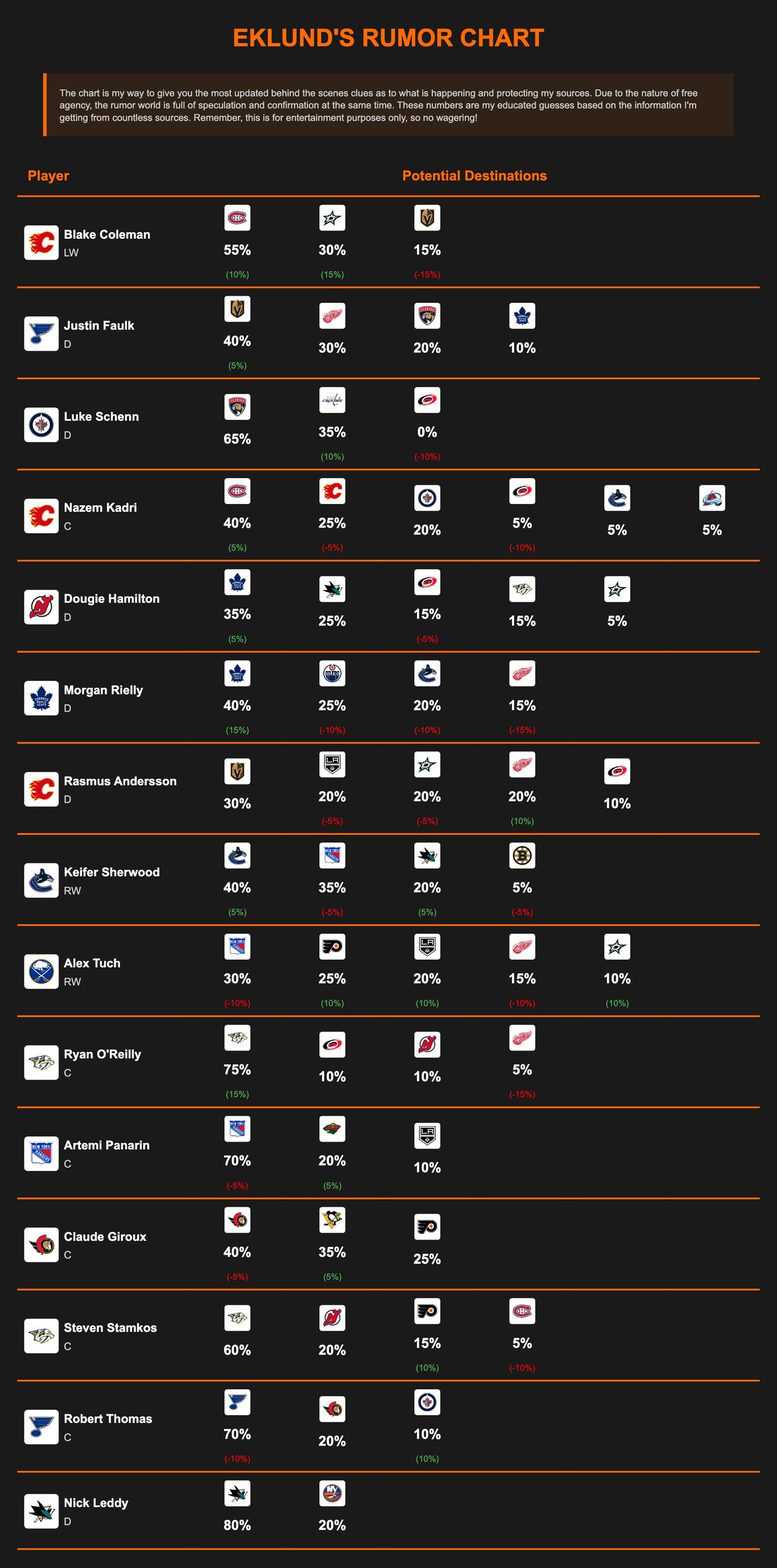 On Nazem Kadri…I cap the rumor chart at six interested teams per player, and Kadri is the only name currently sitting at that maximum. This is very much Montreal’s push…they are aggressively trying to make this happen. If they fall short, the most likely outcomes are Kadri staying in Calgary or Vancouver quietly sneaking into the mix.