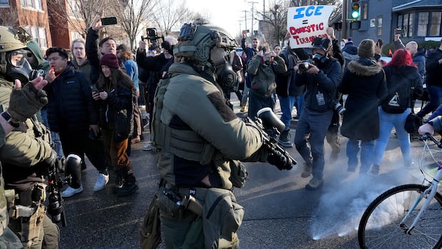 “We’re seeing is this shift within the way the U.S. administration communicates to produce public enemies through their language,” said MacDonald. She cites the example of U.S. President Donald Trump calling protesters “professional agitators” and ICE agents “patriots” on Truth Social Thursday.