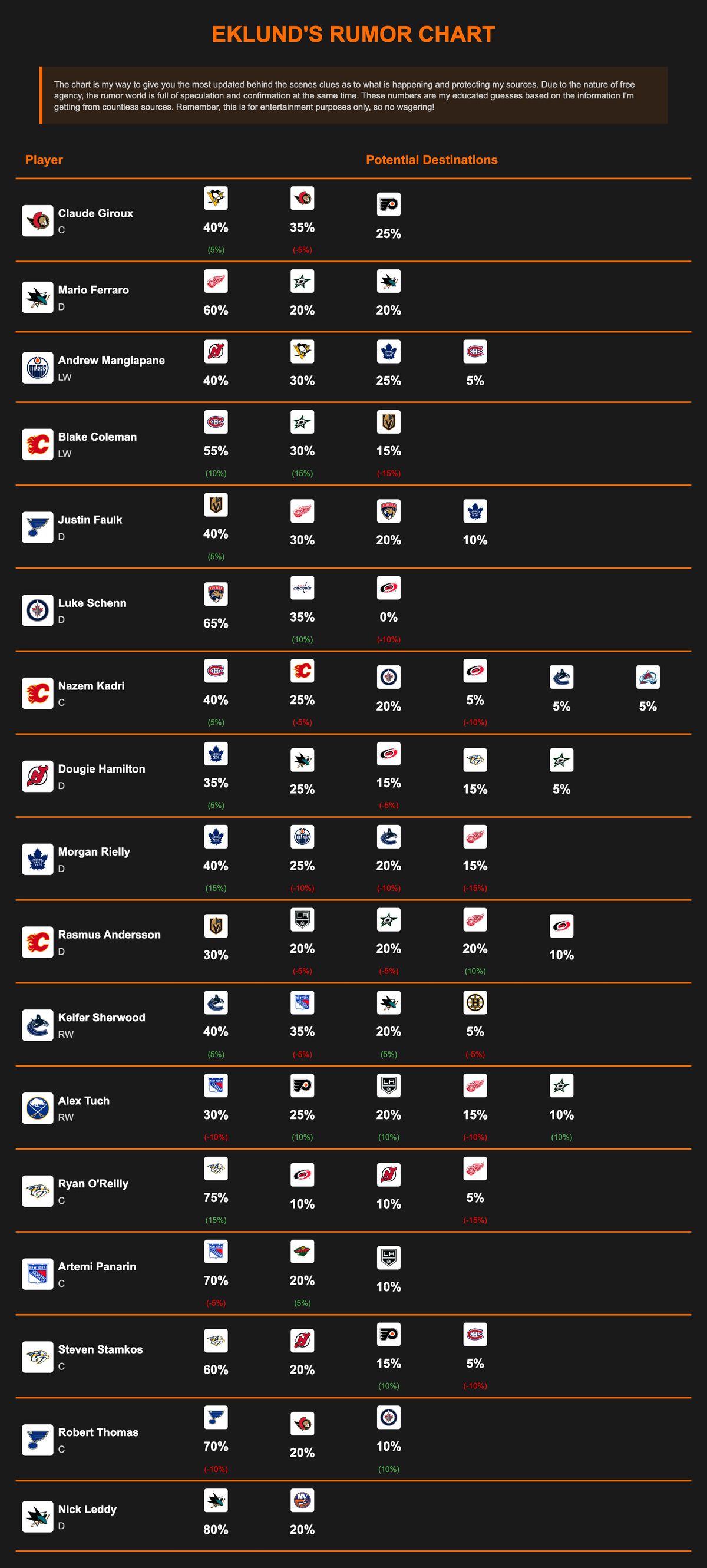 On Rasmus Andersson…Vegas and Detroit are the top two suitors in my opinion, with Vegas currently the favorite. Dallas and Los Angeles are also lingering. The challenge with Andersson is that he has made it clear he intends to test free agency no matter where he is traded—meaning no extension and a pure rental. The big question: how much are teams willing to give up for that?