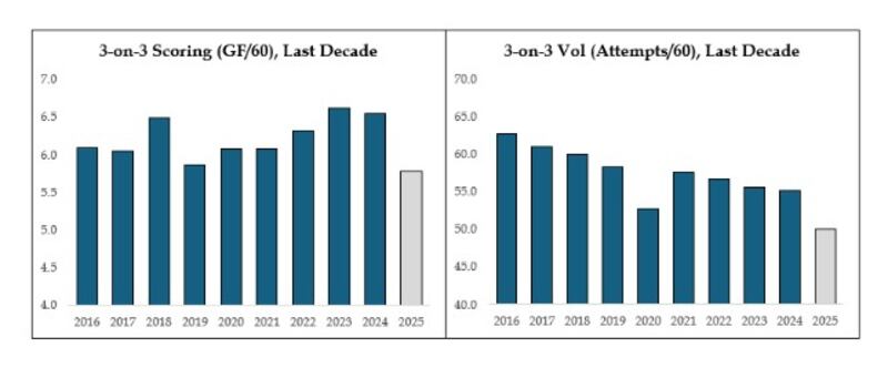 Bringing this back to the NHL: if it feels like the pace during 3-on-3 has felt painfully slow and methodical relative to years past, you’re not wrong. What we are seeing in the data suggests a meaningful change in approach from teams, generating far less offensive volume (and scoring far fewer goals) than anything from the past decade:
