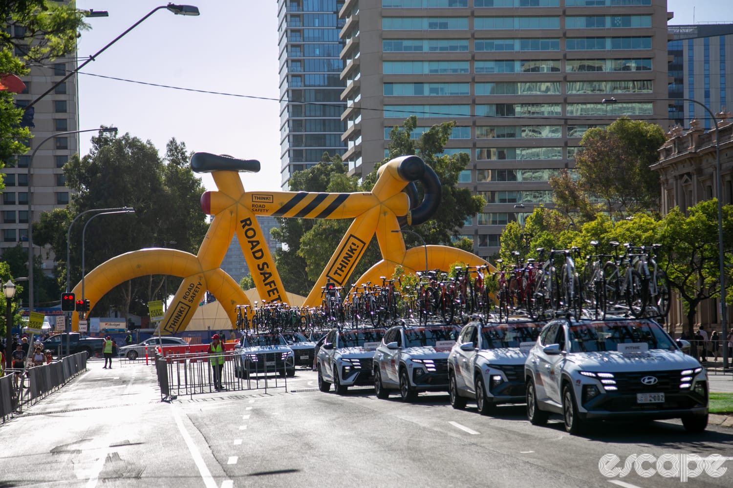 Team cars sit in a long line outside the Santos Tour Down Under event village, under the watchful eye of Saint Francis Xavier’s Cathedral, and the TDU’s Big Inflatable Bike. Michael Gogl (Alpecin-Premier Tech) sets off down the start ramp, his team car follows, and the race’s theme song, ‘Feel the Rush’, bursts to life over roadside loudspeakers. The prologue of the 2026 men’s Tour Down Under is now underway.