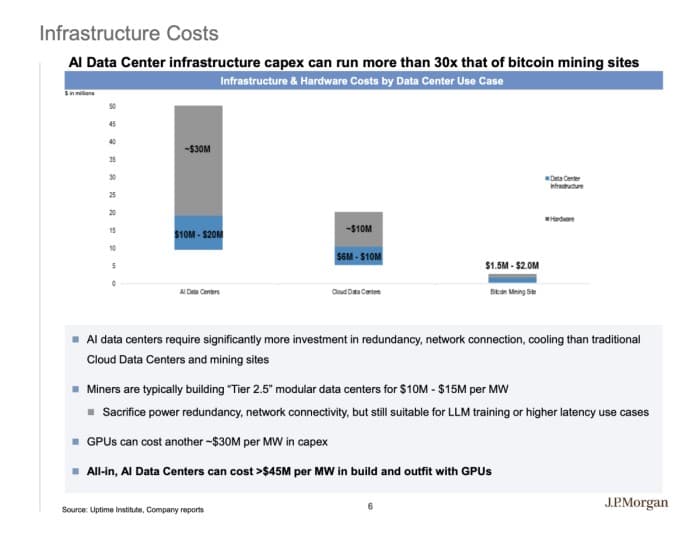 J.P. Morgan estimates that converting existing mining power capacity to HPC applications could cost roughly $10-15 million per megawatt before GPUs, with all-in AI data center costs exceeding $45 million per megawatt once hardware is included. That math explains why expansion across the sector is gravitating toward sites that already work, rather than projects that still need power.