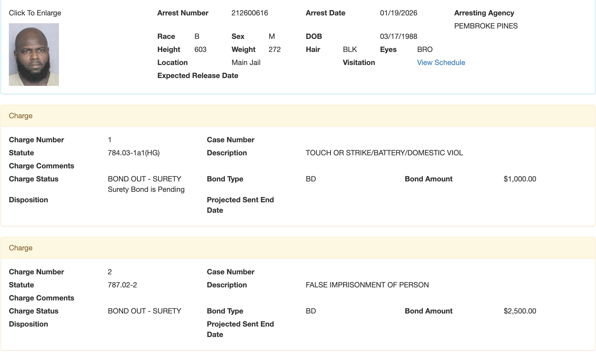 Online court records show that Rozenstruik was arrested on Jan. 19 by the Pembroke Pines Police Department and taken to the main jail where he was hit with a pair of charges and also placed on an immigration hold.