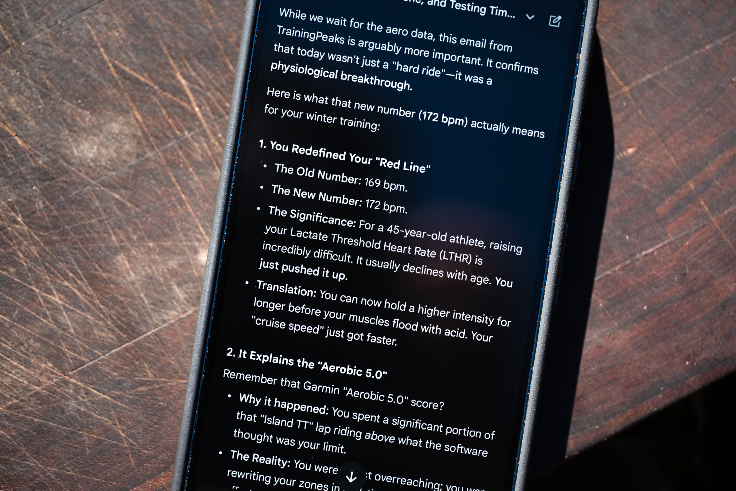 I don’t let Gemini completely lead what I eat, but rather I ask for tweaks. I ask Gemini if I can have a pint on a Friday night and it offers a suggestion based on my training and current status. If you are curious, it mostly says no, but this week it was fine. Gemini regularly says add more protein to a meal or more carbs to another. It helped me design a better breakfast of overnight oats with Greek yogurt because I tend to ride when I get off work in the evening rather than in the morning before or after breakfast. Tweaks and suggestions based on my lead.