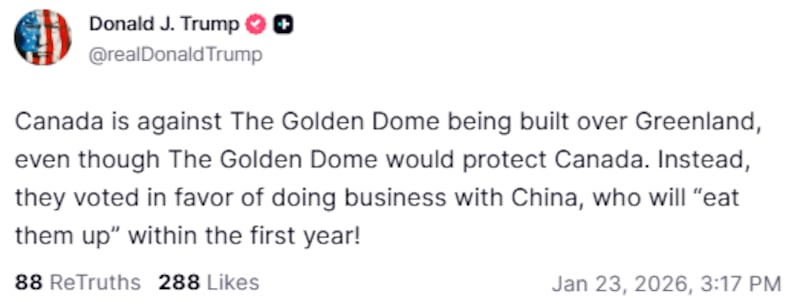 “Canada is against The Golden Dome being built over Greenland, even though The Golden Dome would protect Canada. Instead, they voted in favor of doing business with China, who will ‘eat them up’ within the first year!” the U.S. president wrote on Truth Social.