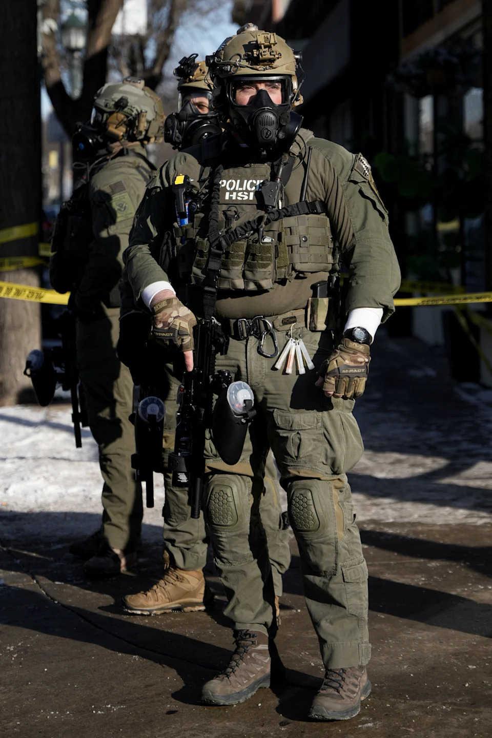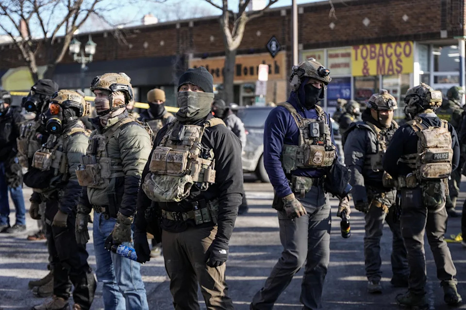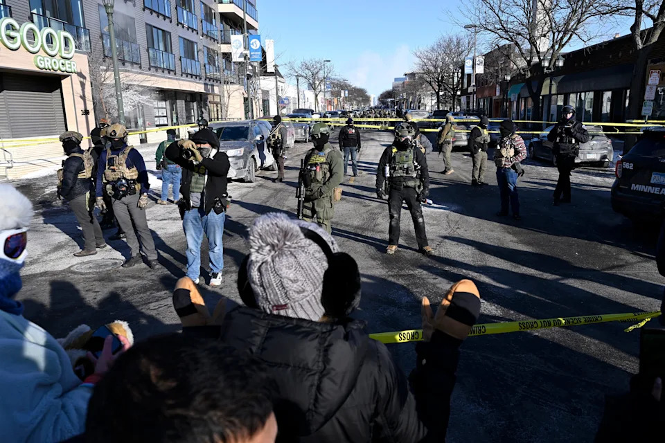 Federal agents stand guard at the scene of a shooting involving federal immigration agents in Minneapolis, Minnesota, January 24, 2026.