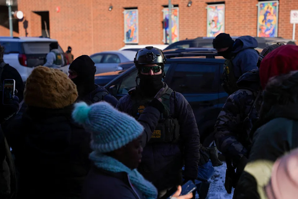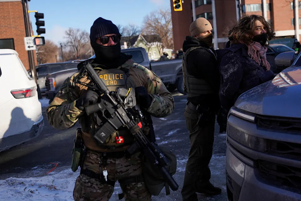 A federal immigration agent stands guard as another detains a person at the scene of a shooting involving federal immigration agents, in Whittier neighborhood, in South Minneapolis, Minnesota, January 24, 2026.