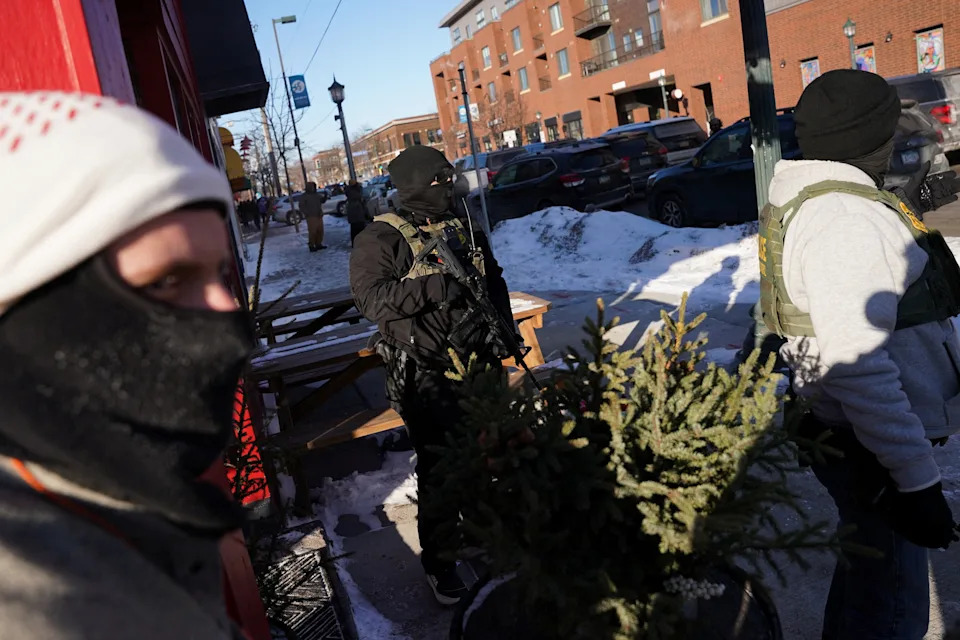 Federal immigration agents stand guard at the scene of a shooting involving federal immigration agents, in Minneapolis, Minnesota, January 24, 2026.