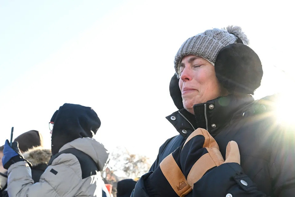 People hug each other at the scene of a shooting involving federal immigration agents in Minneapolis, Minnesota, January 24, 2026.