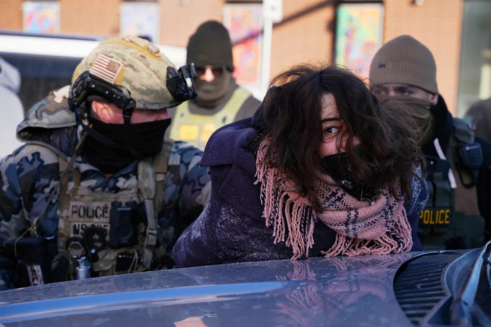 A person is detained at the scene of a shooting involving federal immigration agents in Minneapolis, Minnesota, January 24, 2026.