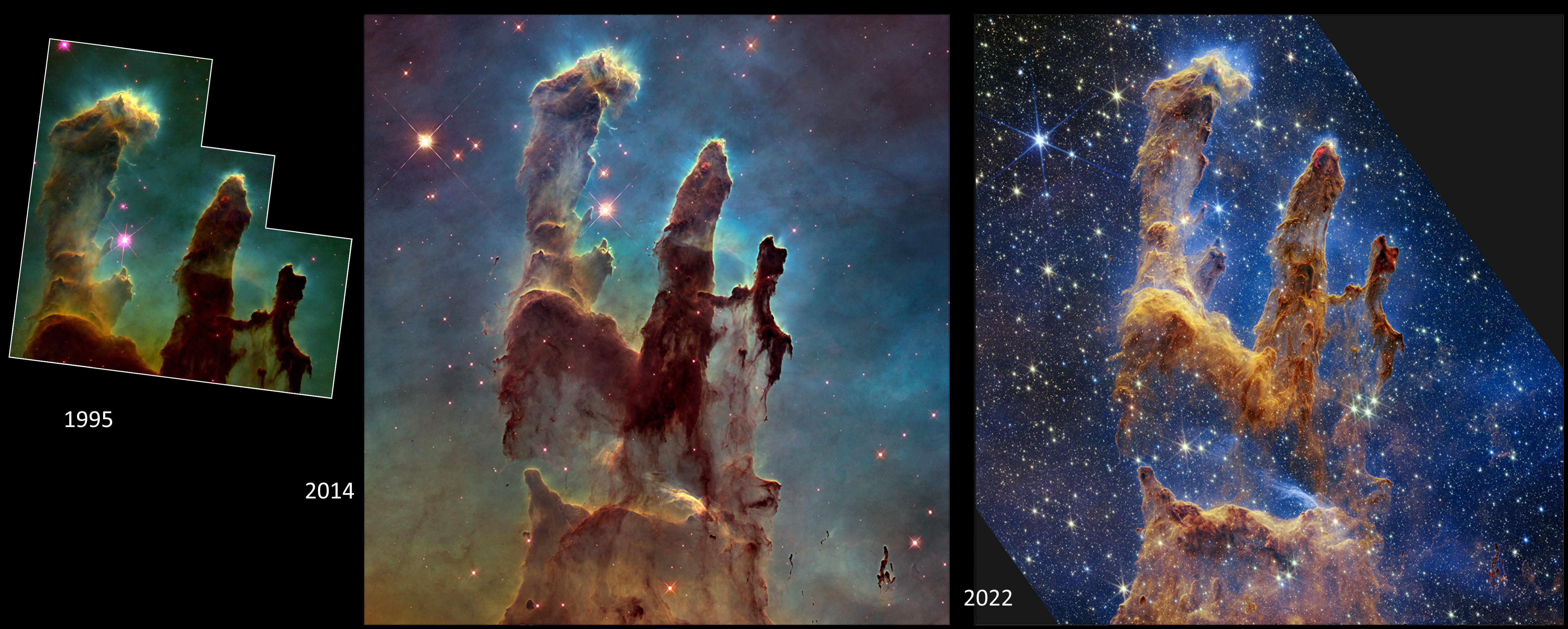 This remarkable three-panel image showcases the same region of space: the Pillars of Creation. On the left, the 1995 Hubble view is shown. At center, the follow-up 2014 Hubble image, with an upgraded instrument suite, is presented. At right, the 2022 view, taken with JWST’s NIRCam imager, is displayed. The variety of features showcases the power of multiwavelength astronomy, but also subtly shows the Pillars shrinking, as external radiation evaporates them away.