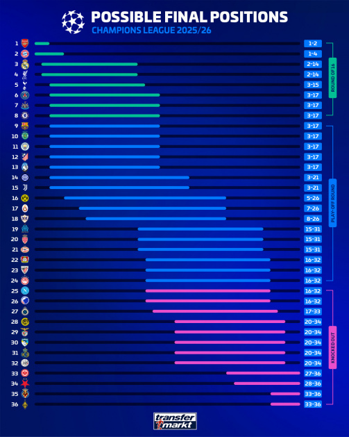 For the teams ranked ninth to 24th, the exact league position also matters because ties are drawn based on league phase placings. In the play-off round, 9th will play 24th, 10th will play 23rd and so on. There are also four teams that are already guaranteed to be eliminated from this season’s competition, as they cannot finish in the top 24 teams: Villarreal, Slavia Prague, Eintracht Frankfurt and Kairat Almaty.