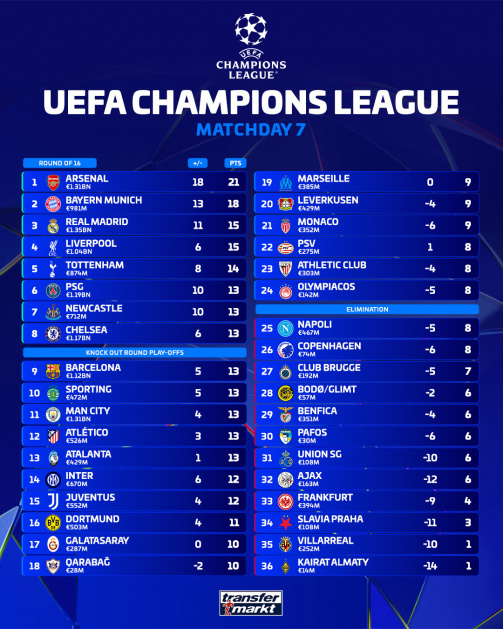 The only two teams that have already confirmed their place in the round of 16 by finishing in the top eight are league leaders Arsenal, who have a 100% win record, and second-placed Bayern Munich. The following 13 teams are now guaranteed at least a place in the play-off round, so essentially they are confirmed to finish in at least the top 24: Atalanta, Atlético Madrid, Bayern Munich, Chelsea, Inter Milan, Juventus, Liverpool, Manchester City, Newcastle, Paris Saint-Germain, Real Madrid, Sporting, Tottenham,