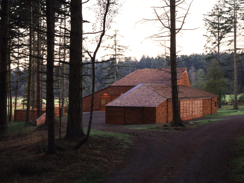 Located in a natural clearing adjacent to a dense stand of fir trees on a farm overlooking the Strait of Juan de Fuca, the Equipment Shed project adopts an L-shaped plan that responds to prevailing winds and provides shelter for an outdoor work area. A tall slatted wood fence extends the protective function. The structure references regional timber construction traditions while employing contemporary formal strategies, with cedar cladding used throughout the exterior. The shed’s massing and geometry create varied visual conditions as the building is approached and viewed from different angles, intended to create a relationship to the surrounding landscape and climate.
