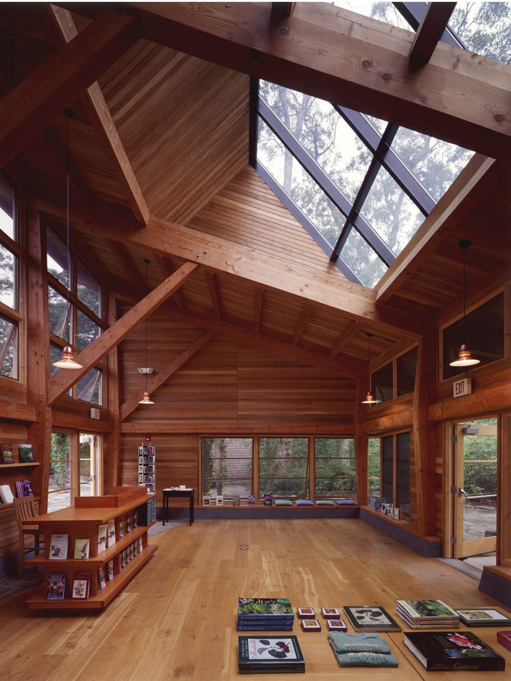 Located within a wooded nature preserve on Martha’s Vineyard, the Polly Hill Arboretum Visitors Center comprises two small buildings designed for public use. The structures are framed in Douglas fir and positioned to integrate with the surrounding landscape. The primary building functions as a gift shop and information center during daytime hours and can be reconfigured for lectures and presentations. Interior furnishings are movable to support multiple layouts. Large roof overhangs provide weather protection and shading, while awning windows enable natural ventilation.