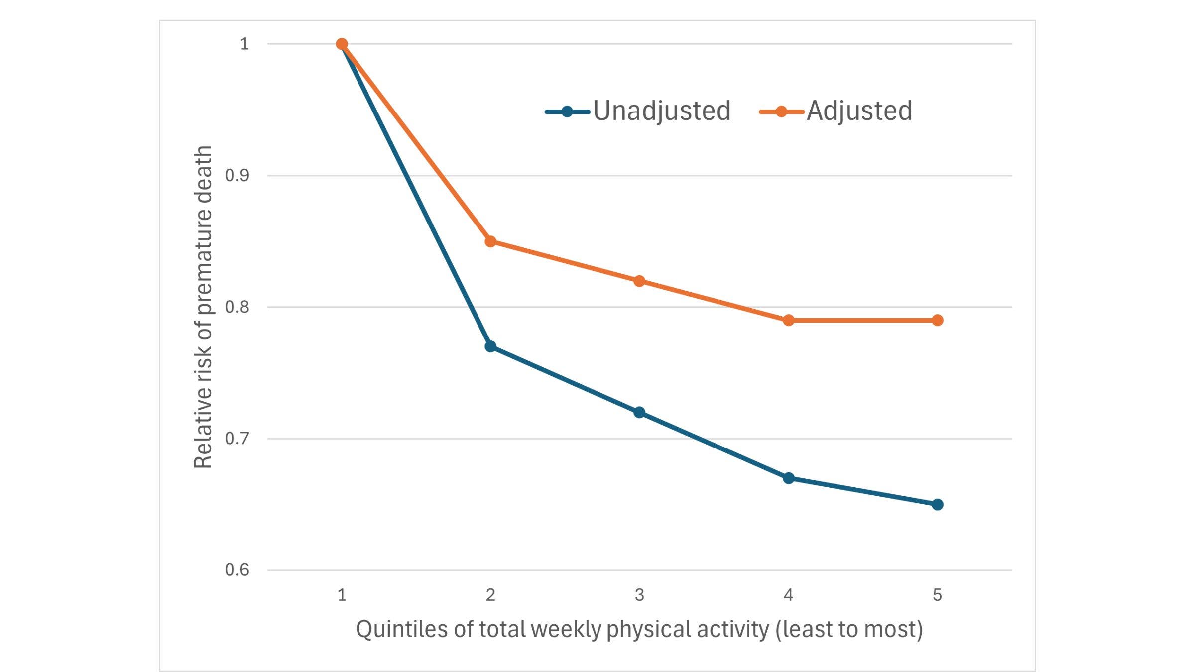 What difference does this statistical adjustment make? Here’s what the relative risk of premature death looks like for five roughly equal groups divided up based on how much physical activity they reported. The “adjusted” data corrects for ethnicity, family history of heart disease or cancer, BMI, smoking status, diet quality, blood pressure, cholesterol, and various other factors: