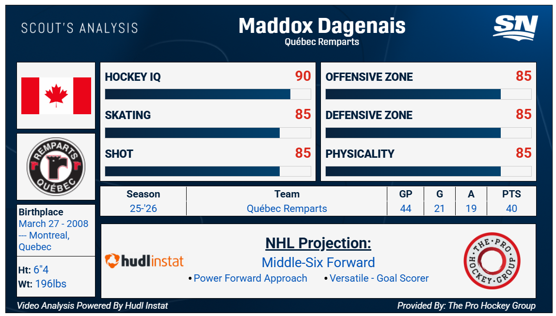 No. 23: Maddox Dagenais, C, 6-foot-4, 196 pounds, Quebec Remparts (QMJHL)