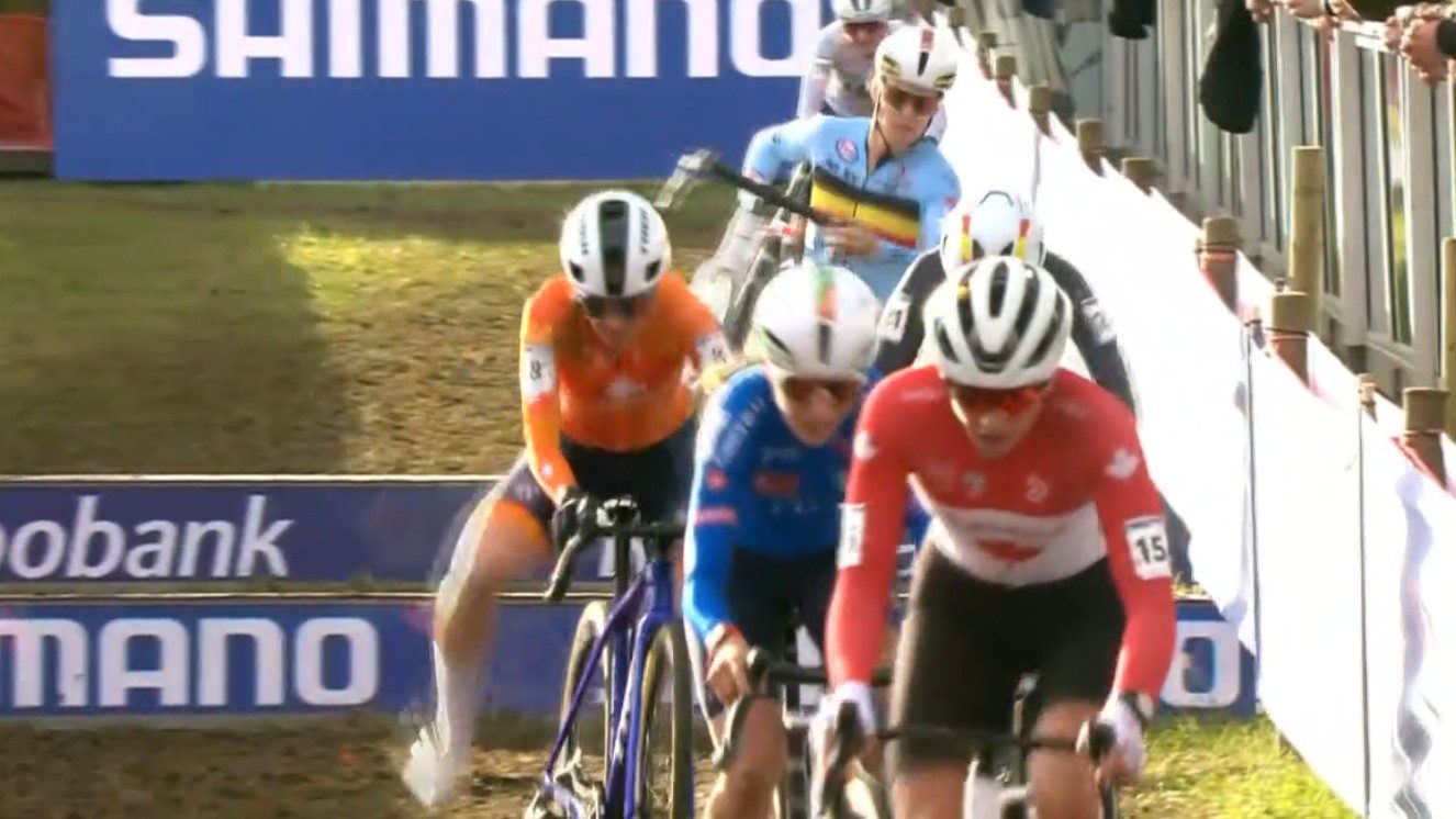 The front row was a sea of Dutch orange. Pieterse grabbed the hole shot, Alvarado in her back pocket. Kate Blanka Vas put herself up with the Dutch mob. Czech Kristýna Zemanová pressured the Dutch from behind. Pieterse bunnyhopped the planks, while Alvarado and Brand carried. Pieterse, Alvarado, Brand, Vas, Zemanová and Jolanda Neff formed the leading sextet, Amandine Fouquenet chasing hard. McGill was 18th, Rochette 24th.
