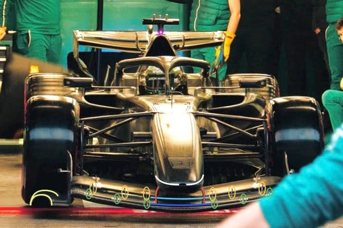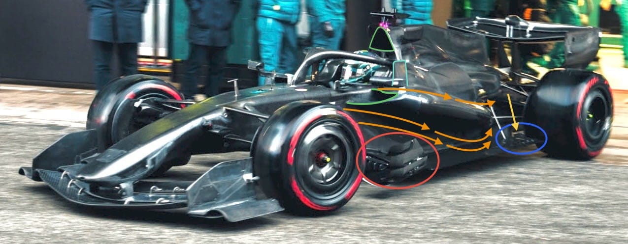 I have highlighted this with the orange arrows. Basically, after defining that shape, you then open up an inlet in the area that has the least negative effect on the overall sidepod flow structure. Aston Martin has returned to the 2023 Adrian Newey Red Bull-style duckbill inlet, highlighted in green.