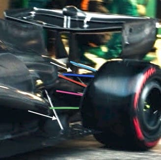 Aston Martin also have the louvres, which are highlighted with the blue ellipse, in the floor section in front of the rear tyre. I can’t see them in detail, but I believe they will connect the airflow on top of the floor in that area with what is called the outward tyre squirt. This is the airflow that is displaced when the tyre rotates onto the track surface. Doing it this way will reduce the tyre squirt going inboard.