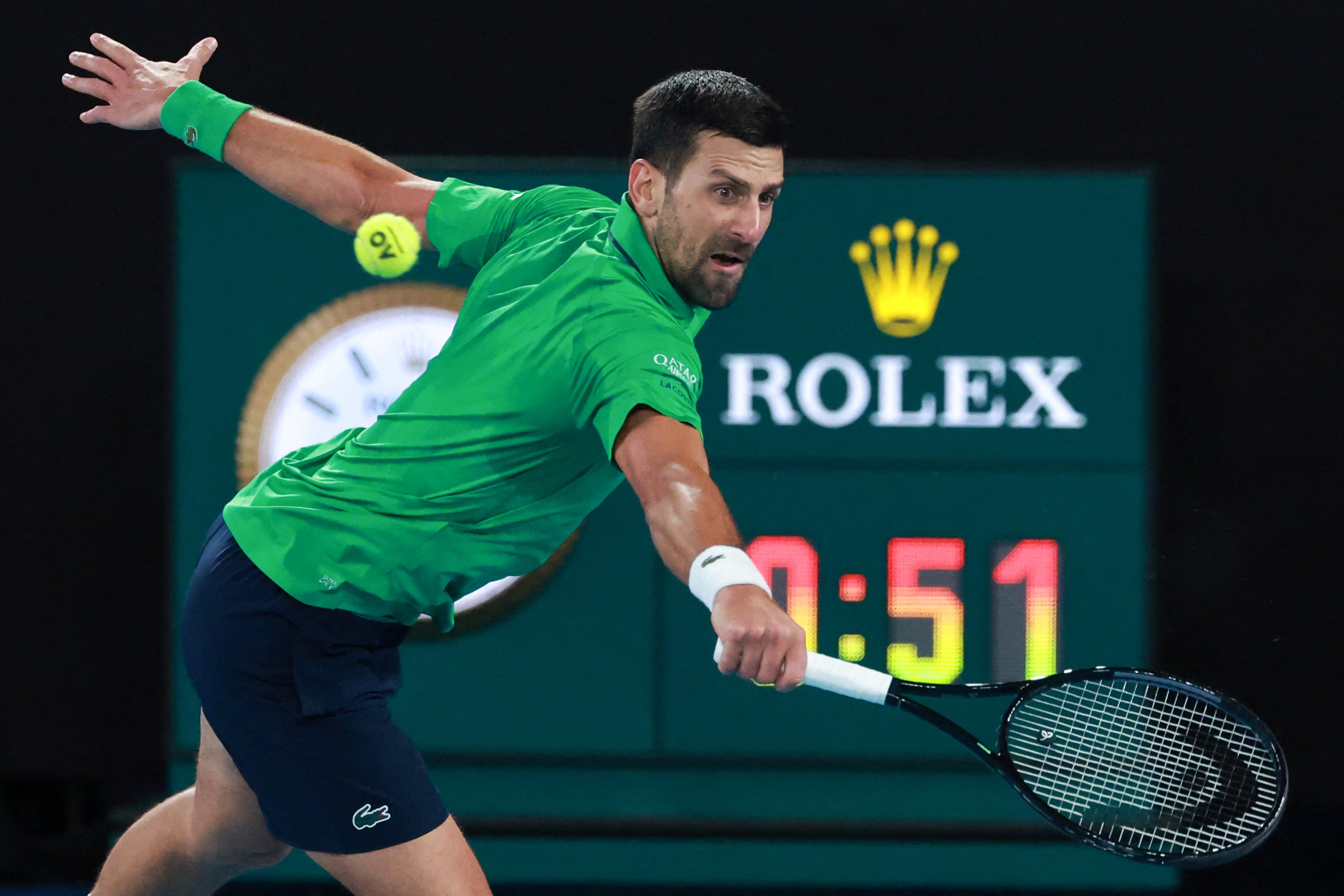From the first set, dominated by Djokovic, Alcaraz is now able to move the ball around the court. Djokovic fires out against a jumping Alcaraz second serve.