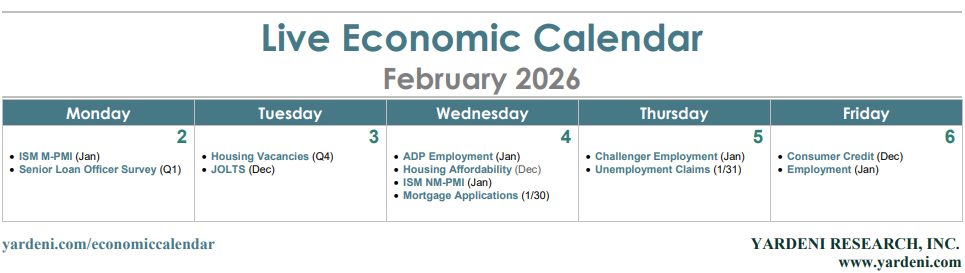 Investors will be assessing how this week’s bevvy of labor market indicators might affect the timing of any future Fed rate cuts. They include December’s JOLTS data (Tue), January’s ADP release (Wed), January’s Challenger layoffs survey (Thu), weekly unemployment insurance claims (Thu), and January’s employment report (Fri).