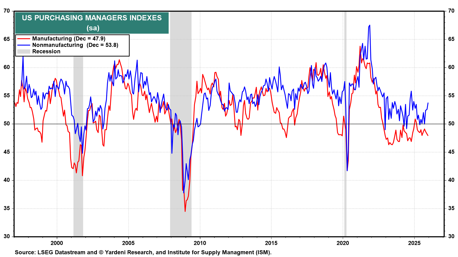 (2) Purchasing managers’ index. The December surveys from the Institute for Supply Management made for mixed readings (chart). Manufacturing slumped to a 14-month low of 47.9. It should improve a bit in January. The non-manufacturing PMI (Wed) should remain well above 50.0. It was 53.8 in December.