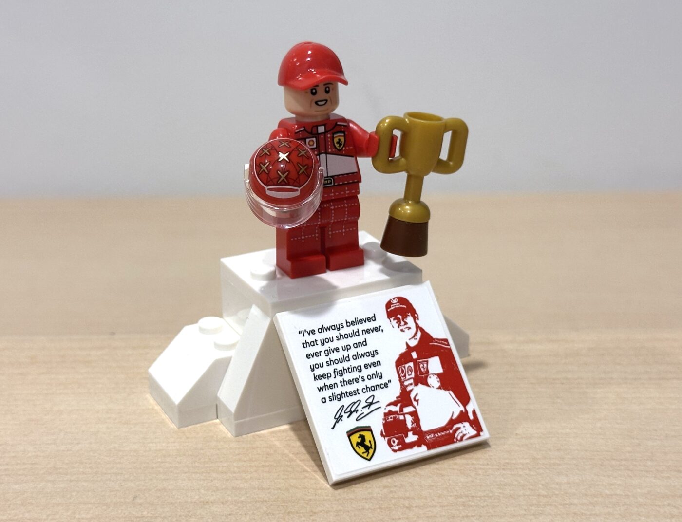 Schumacher comes with a white minifigure stand that has a stickered 4×4 tile – with a fitting quote about how one should always keep fighting.