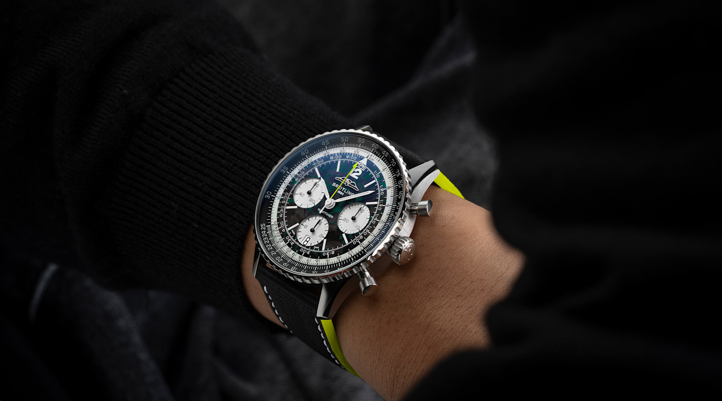 Every element of the Navitimer B01 Chronograph 43 Aston Martin Aramco Formula One Team reflects performance: Aston Martin Racing Green and lime accents drawn from the Aston Martin Aramco livery, a lightweight titanium case – the first ever used on a Navitimer – and a carbon fibre dial inspired by materials found in the cockpit of an F1 car. The textured leather strap recalls a racing harness, while enhanced night-time visibility keeps the watch legible under any conditions.
