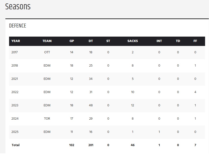 “Ceresna’s 2025 season was dramatically impacted by a meniscus tear in is one his knees that he tried to fight through before being shut down and needing surgery after the Labour Day Classic. He had one sack and 16 tackles in 11 games, but has been a consistent sack producer in his career with 46 quarterback take-downs in 102 games, including a career best 12 in 2023. Over a stretch from 2018-24 and before last year’s injury, Ceresna averaged just under nine sacks per season.” (Source).