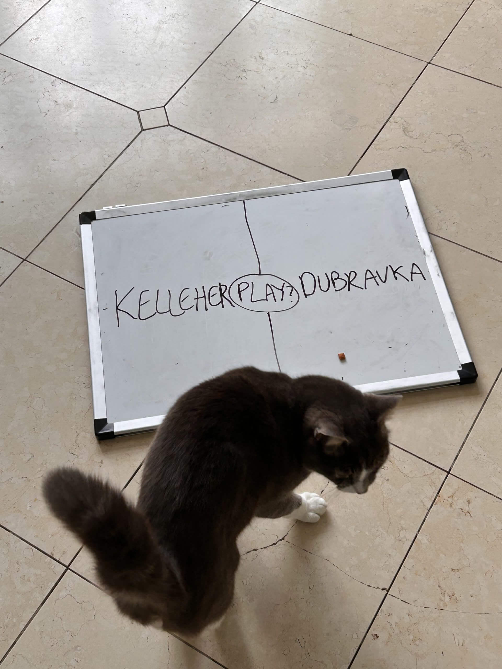 Each week, we give Victor several decisions to make. We write down a question on a whiteboard, divide the board into several choices, and put a cat treat on each of the sections. Whichever treat he eats first is the move we make for him.