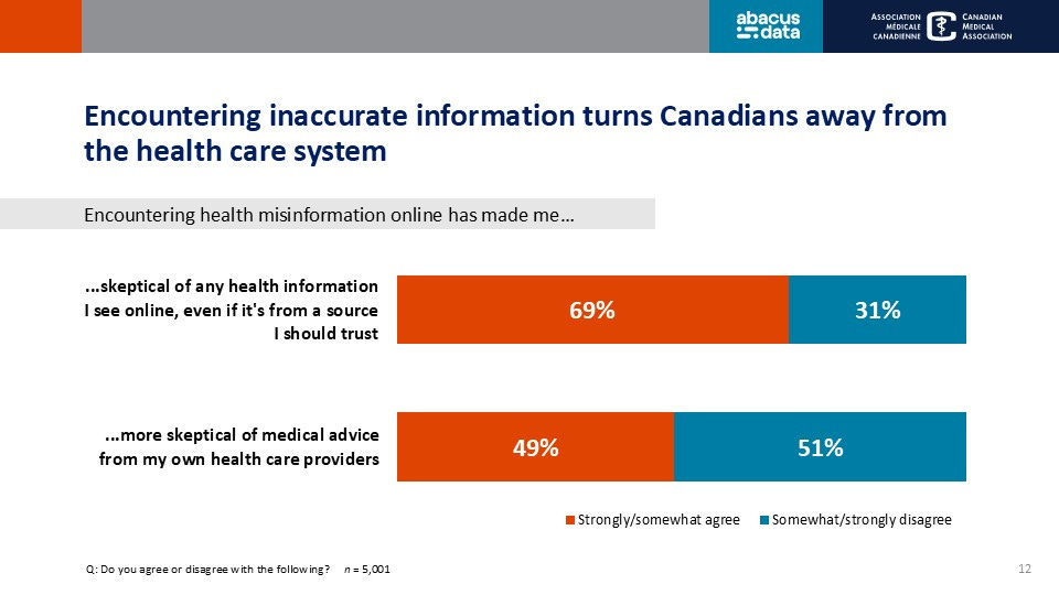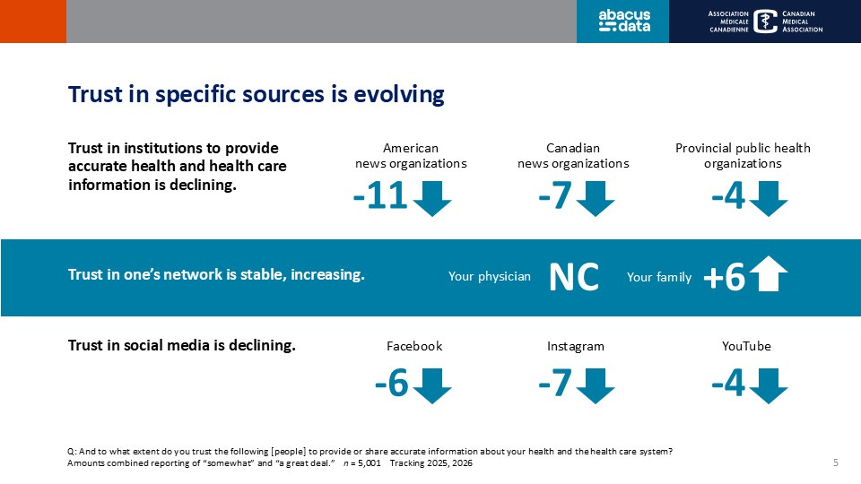 At the same time, trust is shifting. Trust in institutions that have traditionally been authoritative sources of health information is declining. Trust in social media is also declining. And yet trust in personal networks is holding, and in some cases increasing. Trust in physicians and family remains comparatively strong, while trust in news organizations, both Canadian and American, has dropped sharply over the past year.